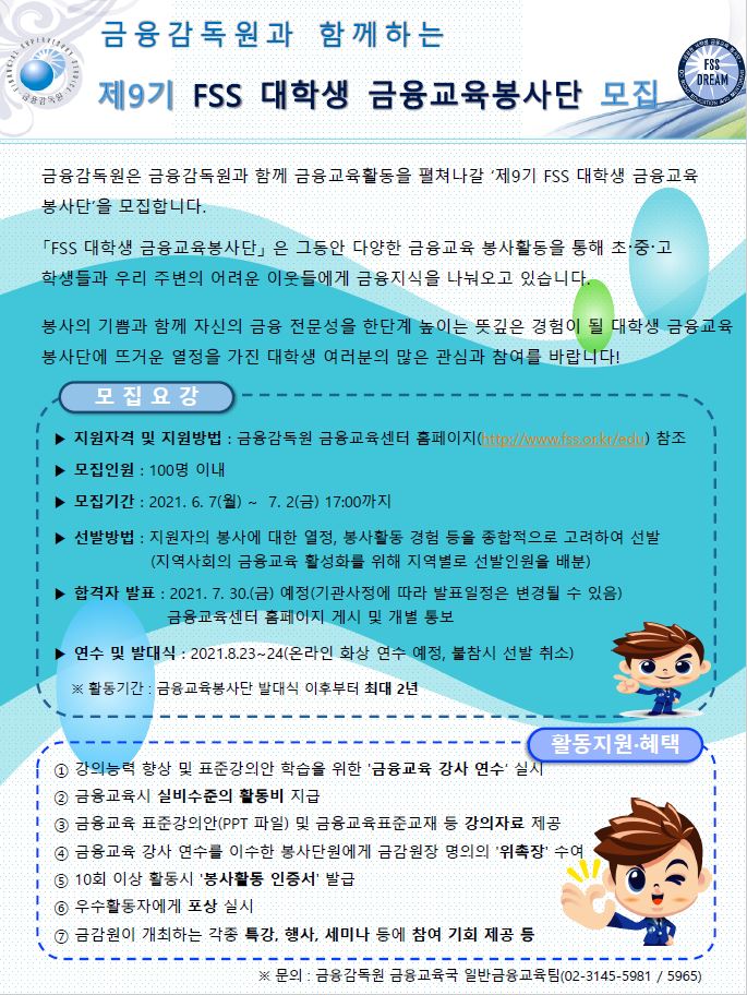 금융감독원 제9기 「FSS 대학생 금융교육 봉사단」 모집(~7.2)