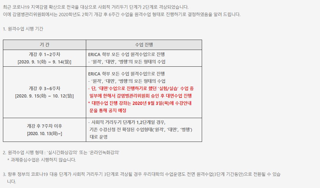 3. 향후 정부의 코로나19 대응 단계가 사회적 거리두기 3단계로 격상될 경우 우리대학의 수업운영도 전면 원격수업(3단계 기간동안)으로 전환될 수 있습니다.