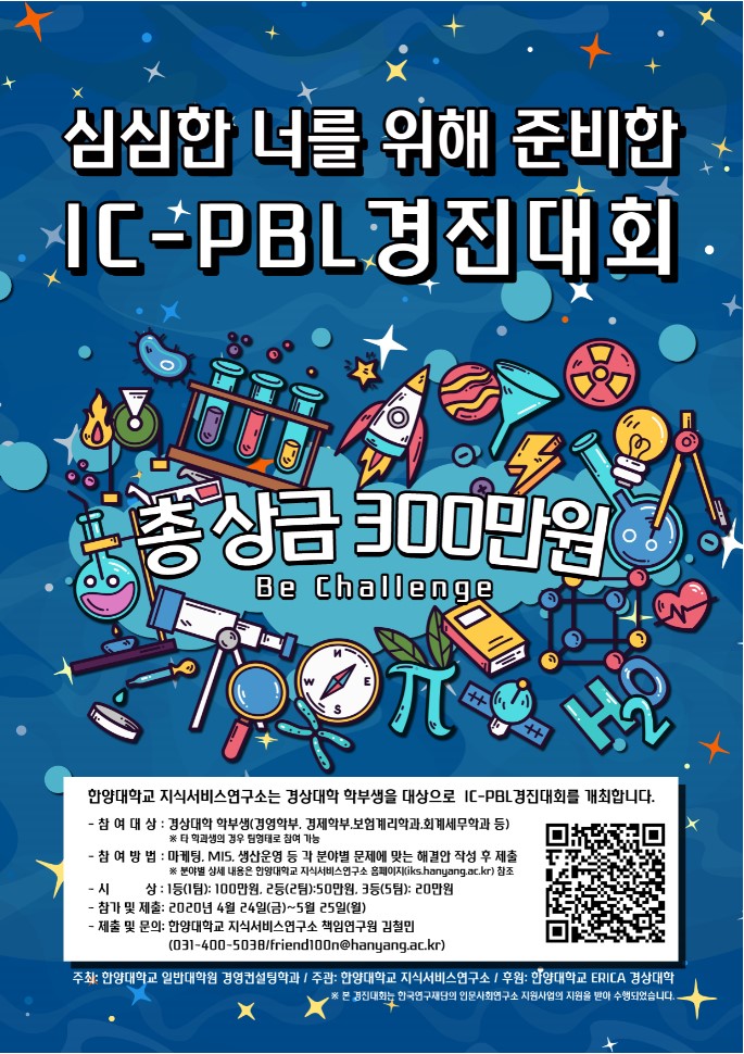 한양대학교 지식서비스연구소는 IC-PBL 연구 성과 확산과 발전을 위해 경상대학 학생을 대상으로 IC-PBL 경진대회를 개최합니다. 본 경진대회를 통해 경상대학 학생들이 스스로 데이터 분석 등의 3개 분야, 총 6개의 제시된 문제 상황을 파악하고, 1개를 선택해 IC-PBL 방법론을 통한 문제 정의 및 해결 방안을 제시하게 됩니다.