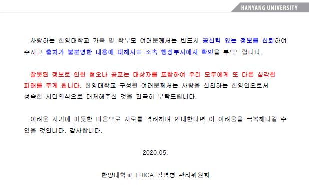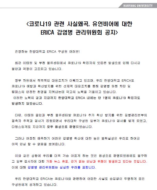 [감염병관리위원회]코로나19 관련 감염병 관리위원회(ERICA) 공지사항