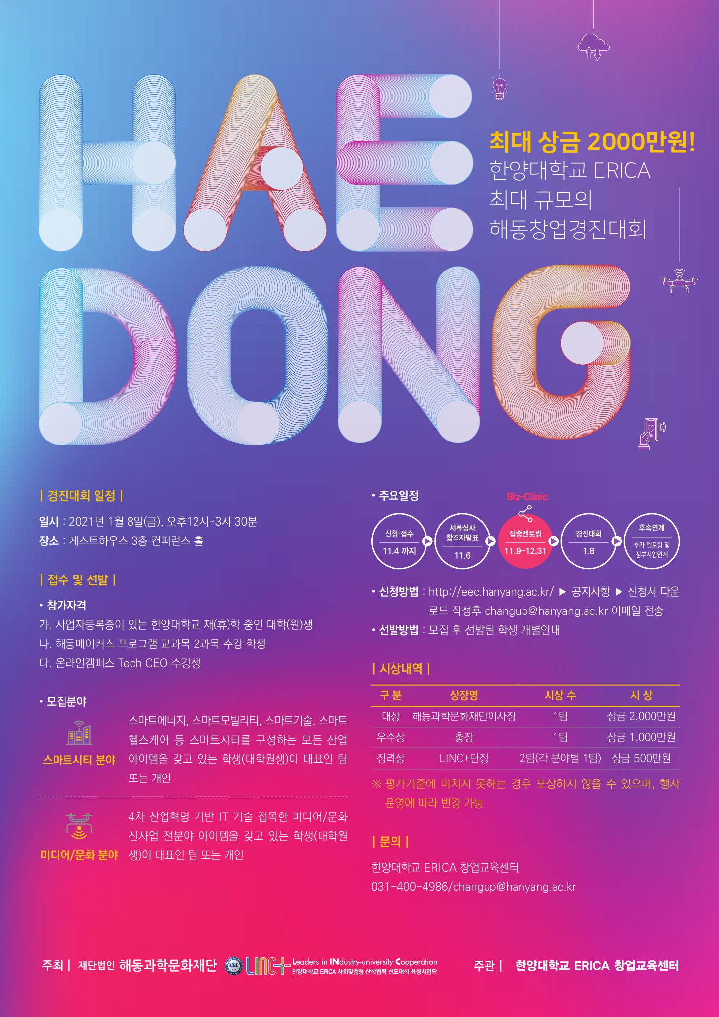 해동창업경진대회는 창업교육센터와 해동과학문화재단에서 실시하는 학생창업기업 육성프로그램입니다.