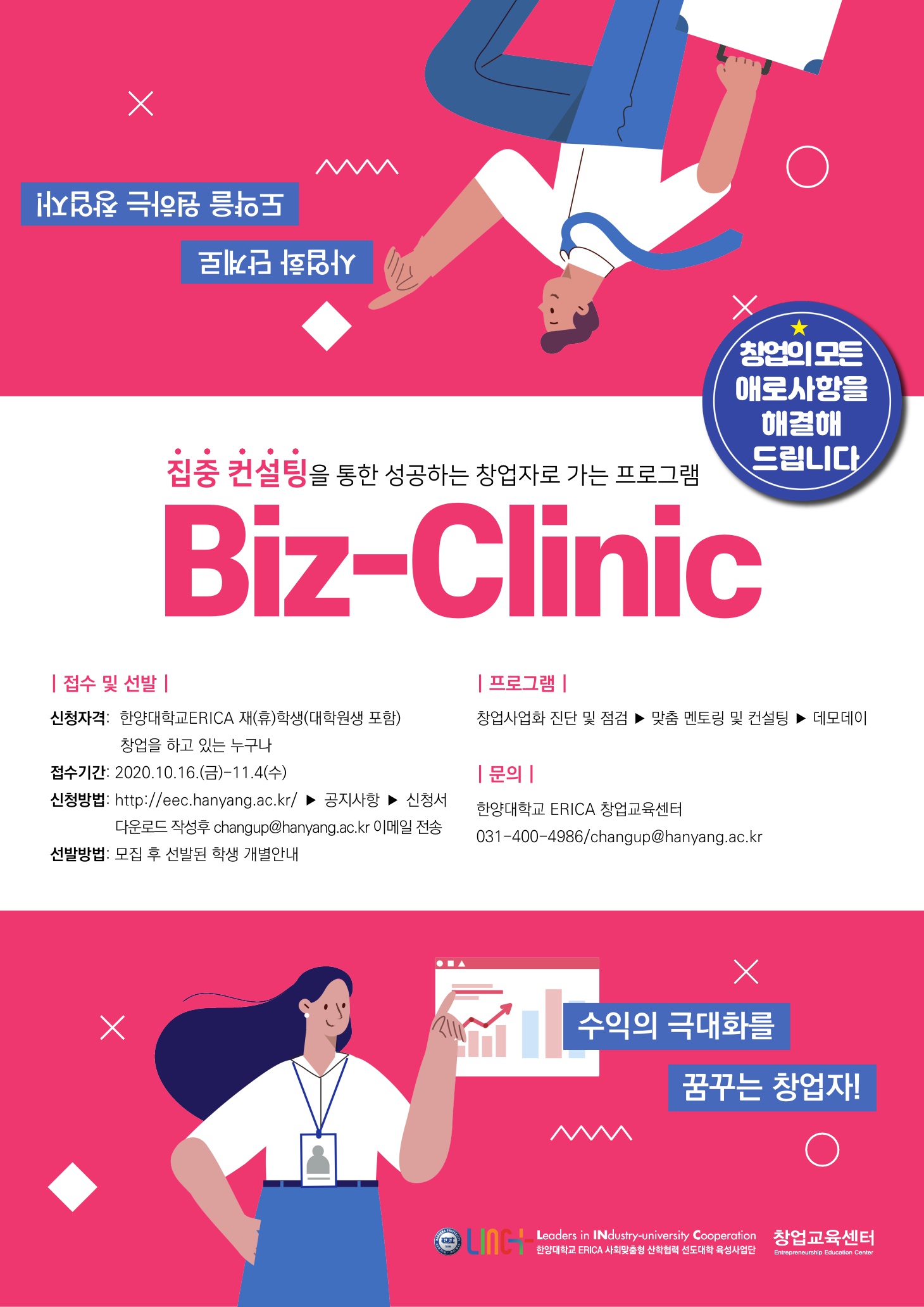 창업교육센터에서 다음과 같이 Biz-Clinic(창업 애로사항을 점검 및 맞춤 컨설팅) 참가 학생을 모집 안내합니다.