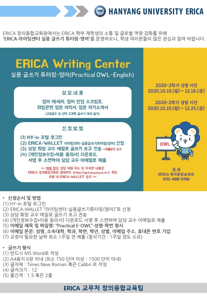 ERICA 라이팅센터 글쓰기 튜터링(영어) 운영 안내