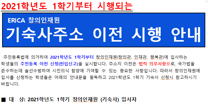 [창의인재원]기숙사주소 이전 시행 안내 (2021-1학기부터)