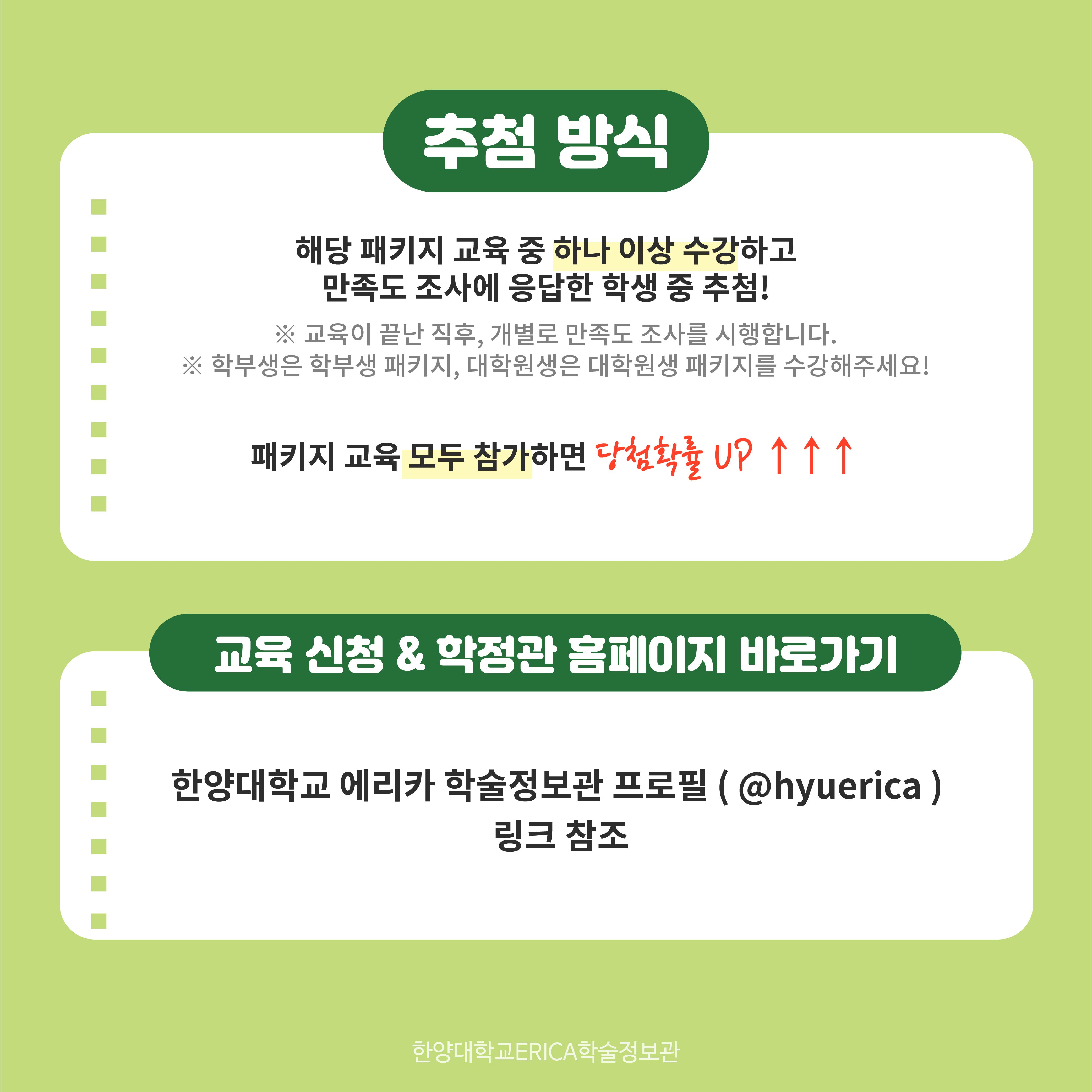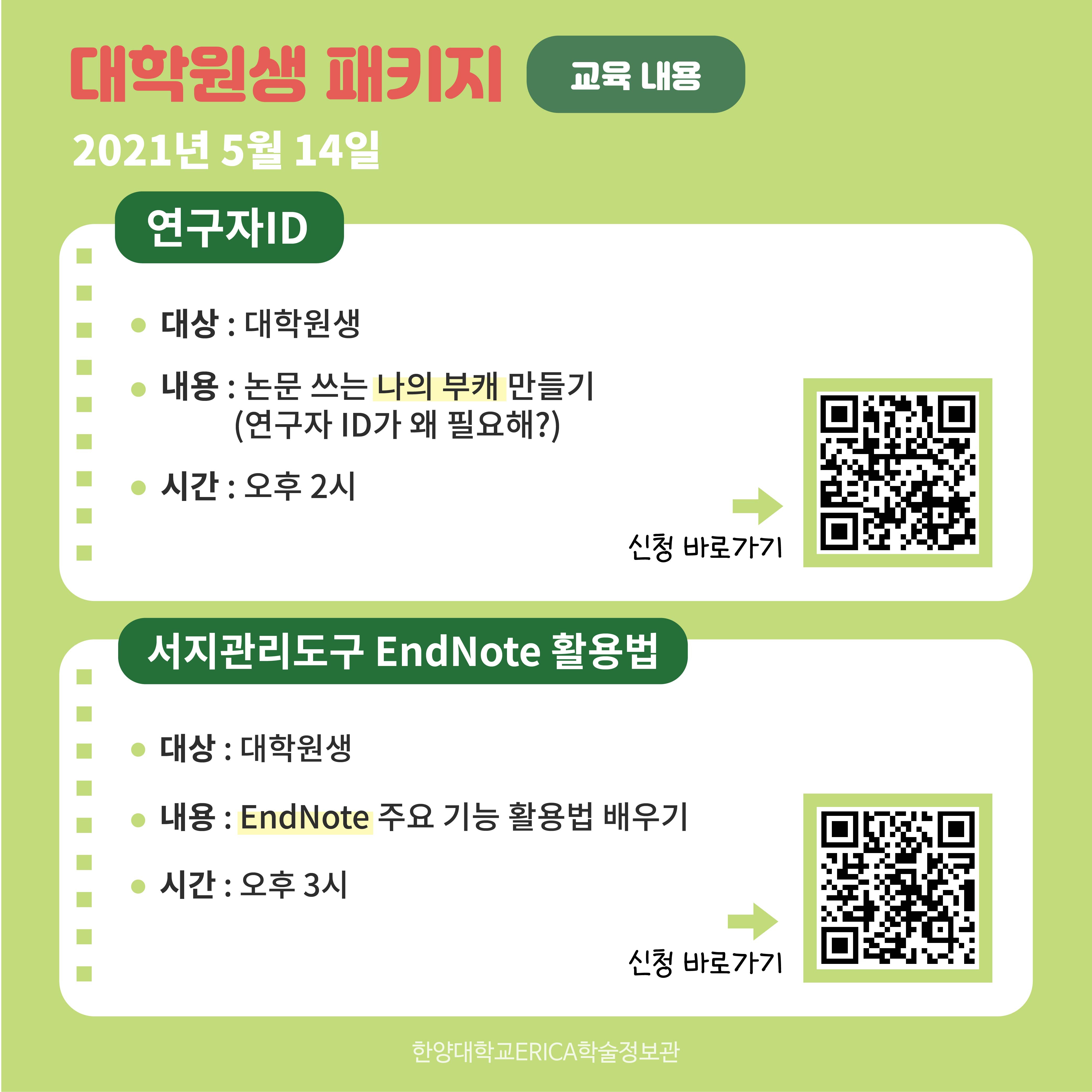 ERICA 학술정보관에서는 아래와 같이 학부생과 대학원생을 위한 5월 교육 패키지를 안내합니다.
