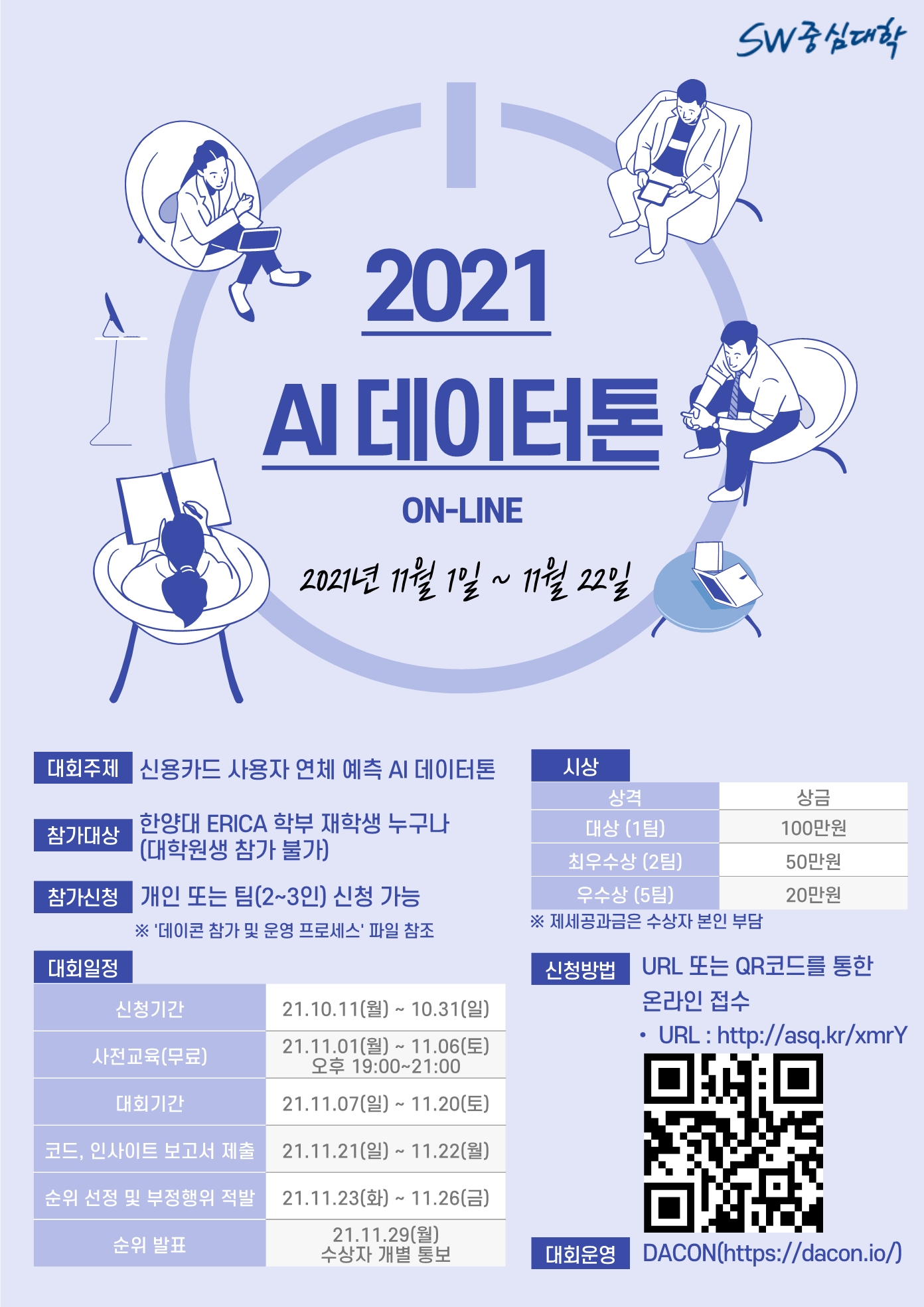 SW중심대학사업단에서는 전교생 대상으로 ‘2021 AI 데이터톤(ON-LINE)’을 아래와 같이 개최합니다.