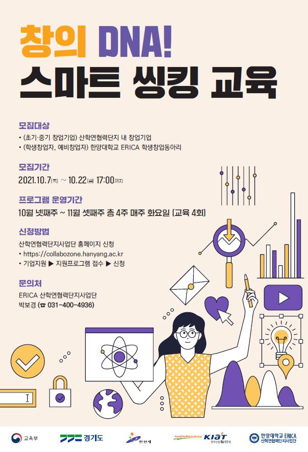 한양대학교 ERICA 산학연협력단지사업단에서는 단지 내 입주기업과 창업동아리의 창의적인 문제해결 방법 교육 프로그램을 구축하고자 창의 DNA! 스마트 씽킹 교육을 아래와 같이 공모하오니 많은 참여 바랍니다.