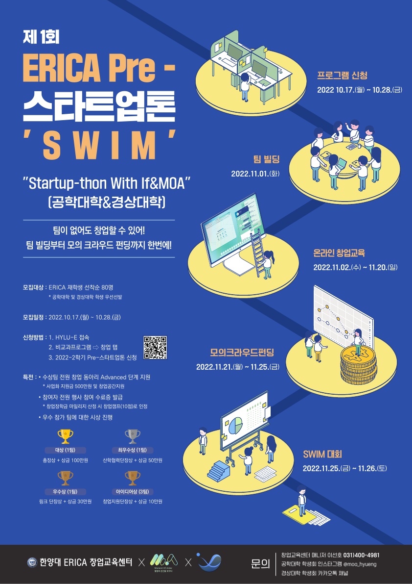 한양대학교 ERICA 창업교육센터에서는 교내의 창업 유망팀 발굴 및 창업문화 확산을 위하여 ‘2022학년도 ERICA Pre-스타트업톤 SWIM’을 진행하고자 합니다.