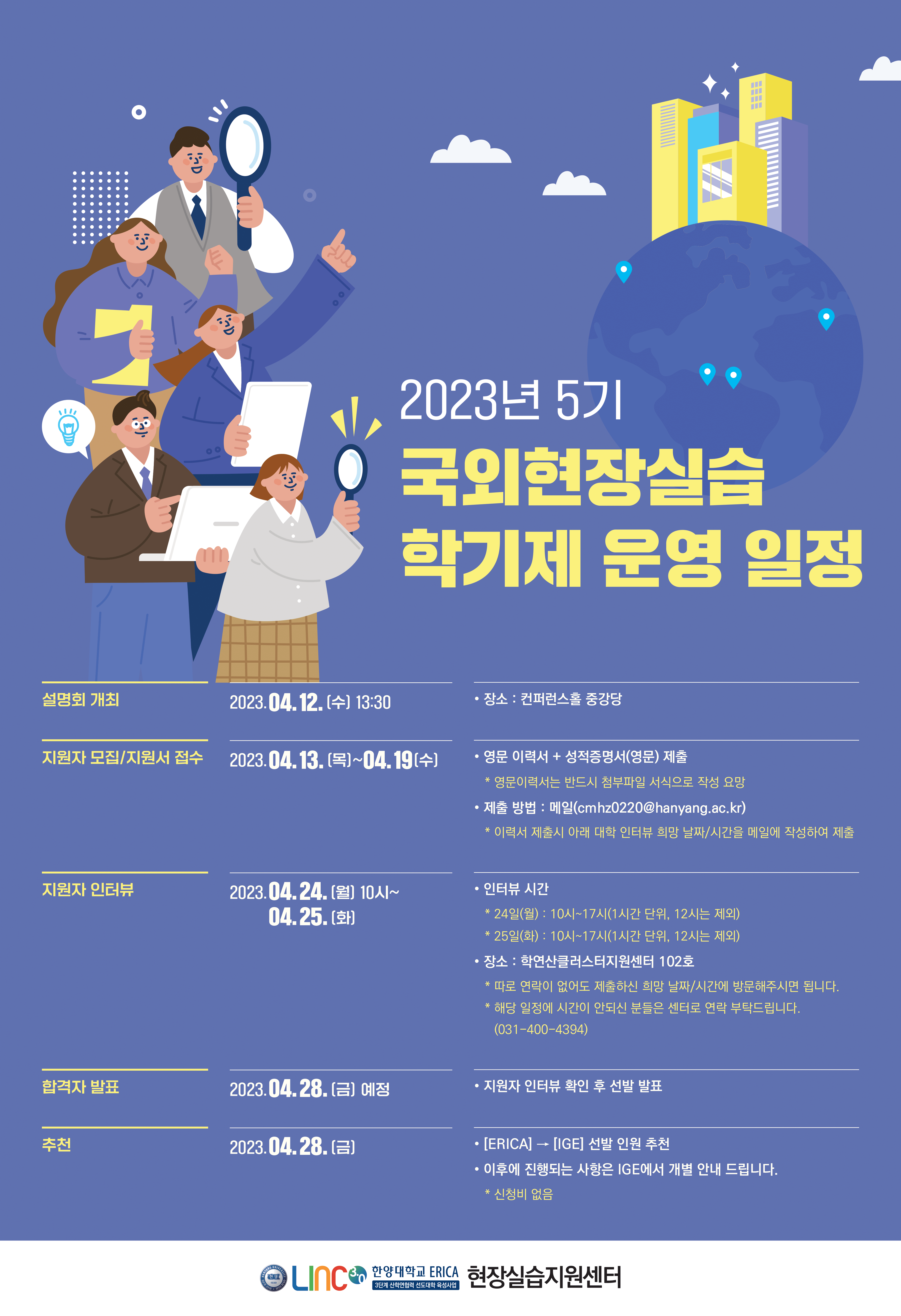 ERICA 현장실습지원센터에서는 매 학기 국외 현장실습학기제 현장실습생을 모집하고 있으며 현재 국외 장기현장실습학기제 5기를 준비하고 있습니다.