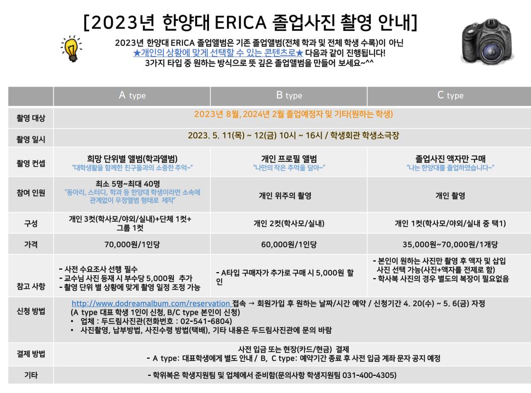 2023학년도 1학기 ERICA 졸업 사진 촬영 일정을 아래와 같이 안내하오니 참고하시기 바랍니다.