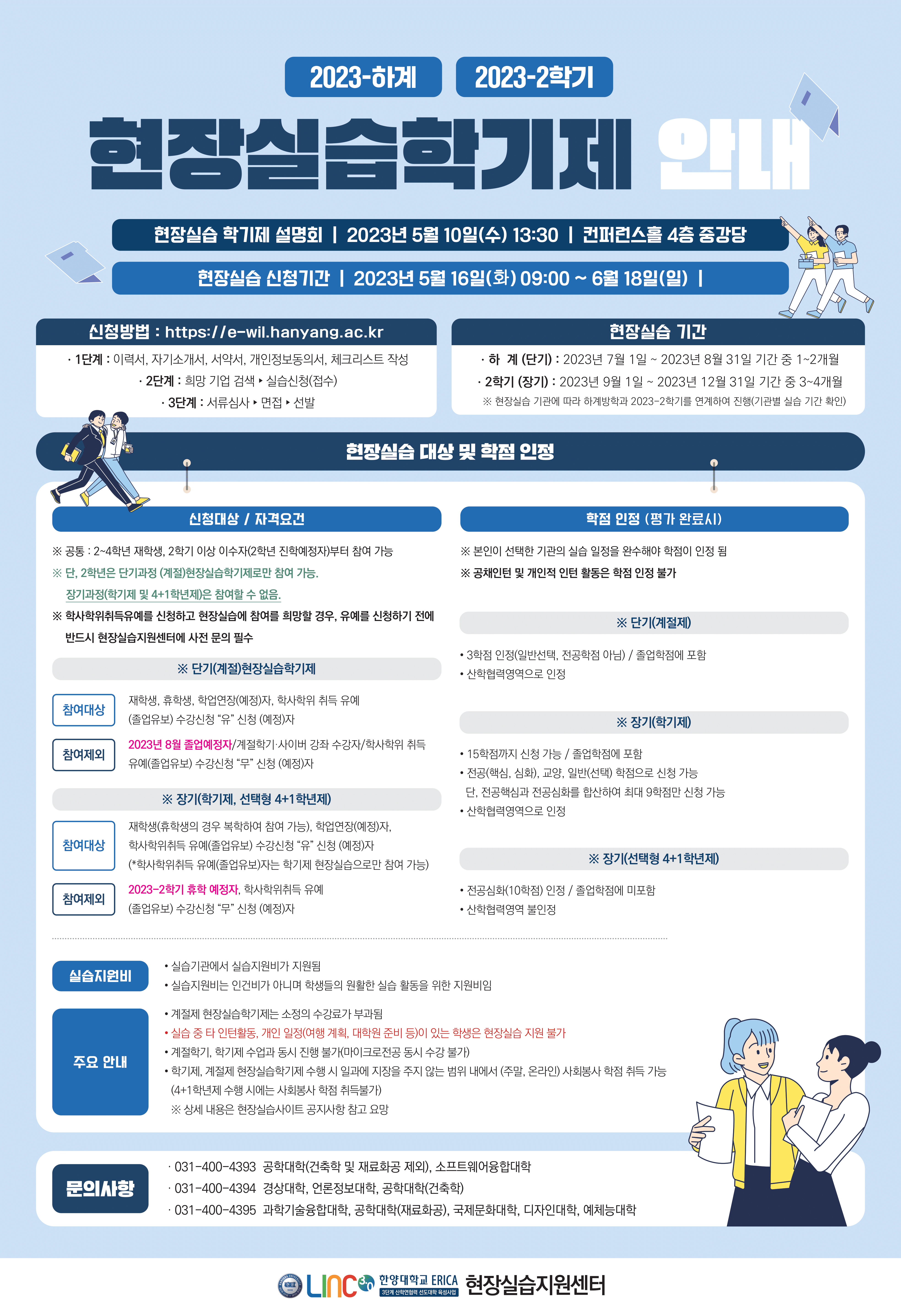 2023년 하계/(연계)2학기 현장실습학기제가 아래와 같이 진행되오니 학생 여러분의 많은 관심과 참여를 바랍니다.