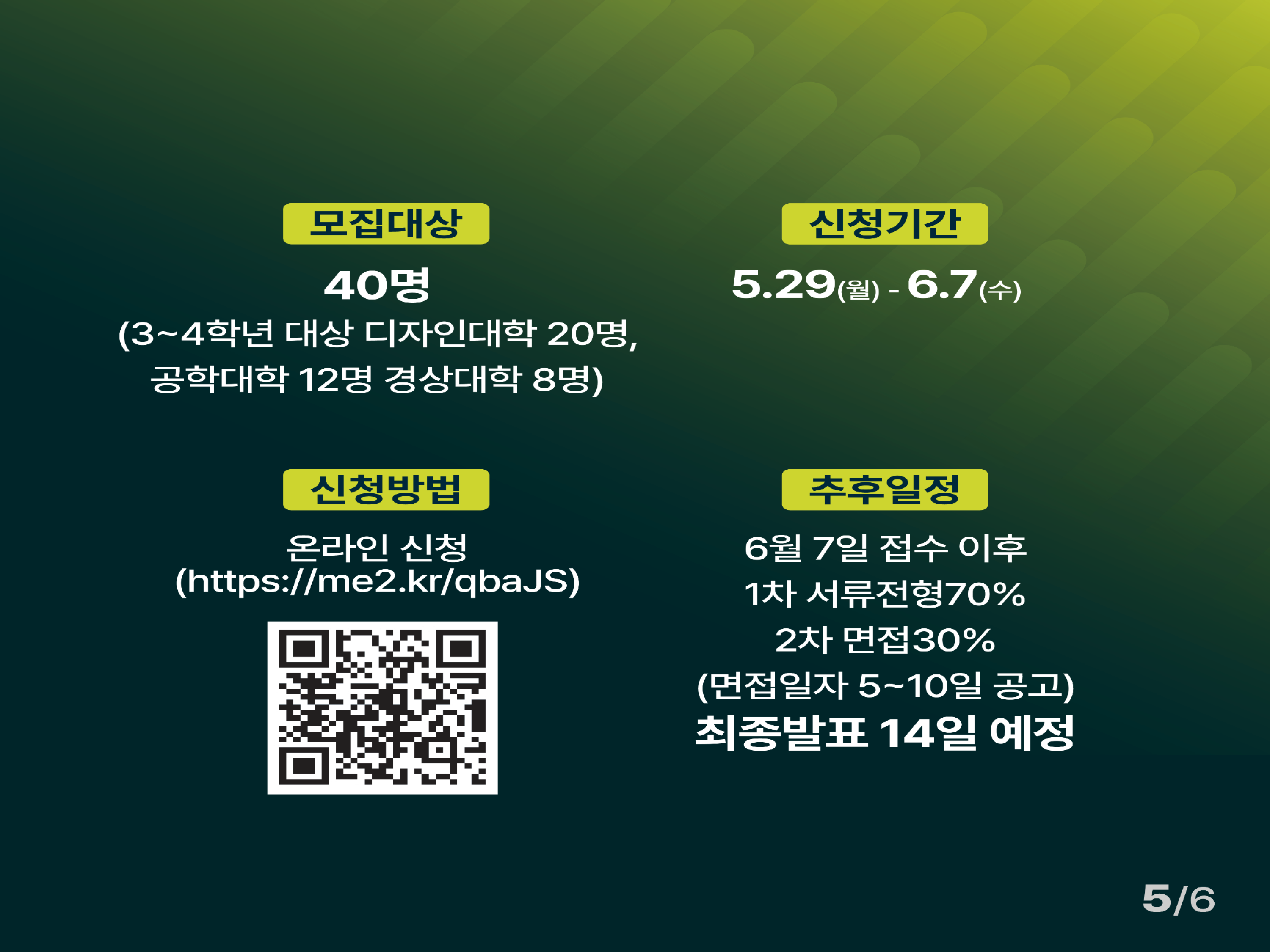 ○ 모집대상 : 40명(3~4학년 대상 디자인대학 20명, 공학대학 12명, 경상대학 8명)