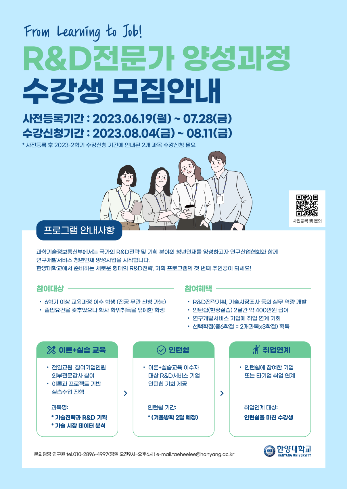 R&D전문가 양성과정 수강생을 다음과 같이 모집하오니, 학생 여러분의 많은 관심과 참여 바랍니다.