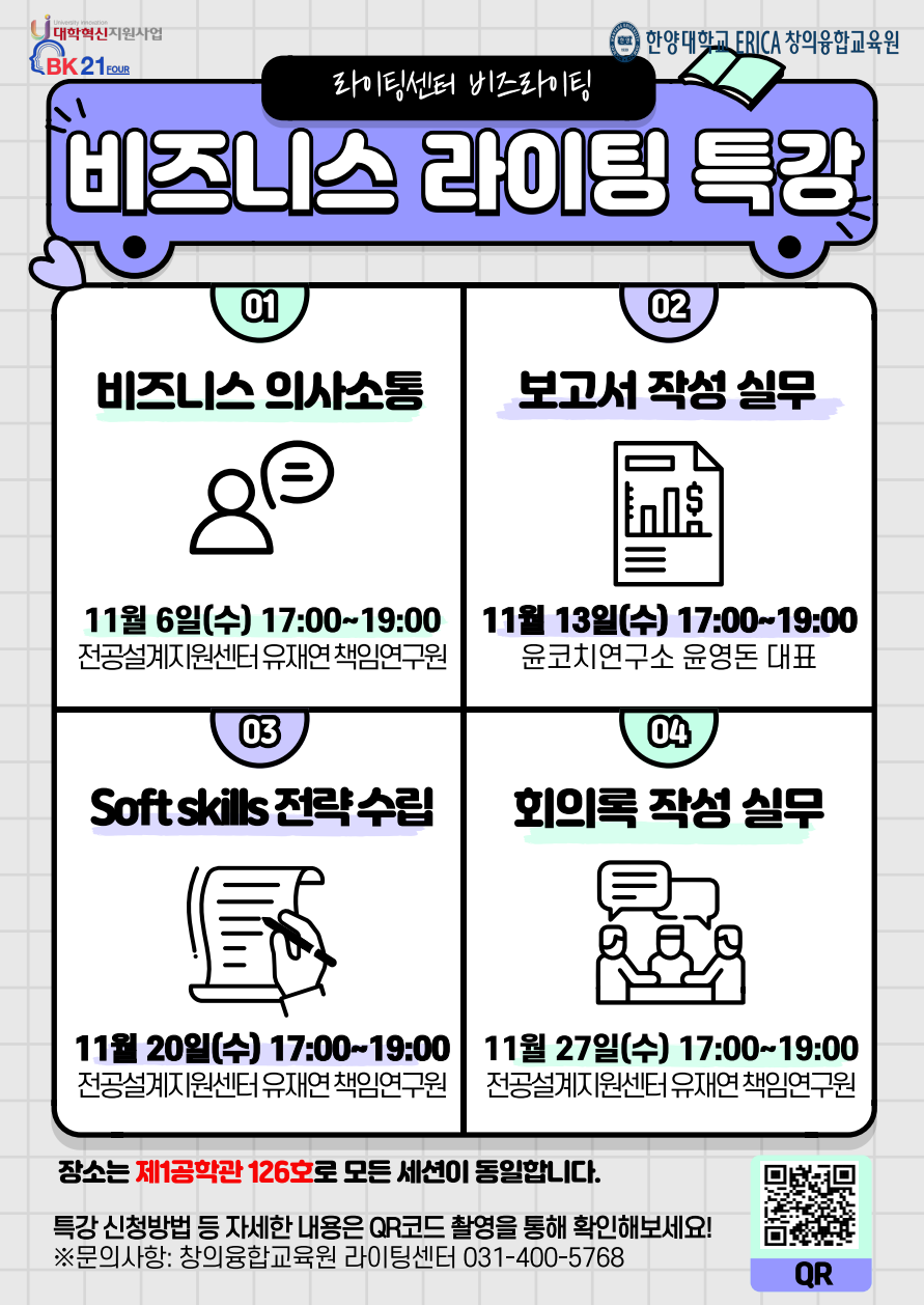 마. 신청방법: 포스터 QR코드 접속 혹은 비교과통합관리시스템(HY-LU-E) 접속 후 '비즈니스 라이팅' 검색해서 신청