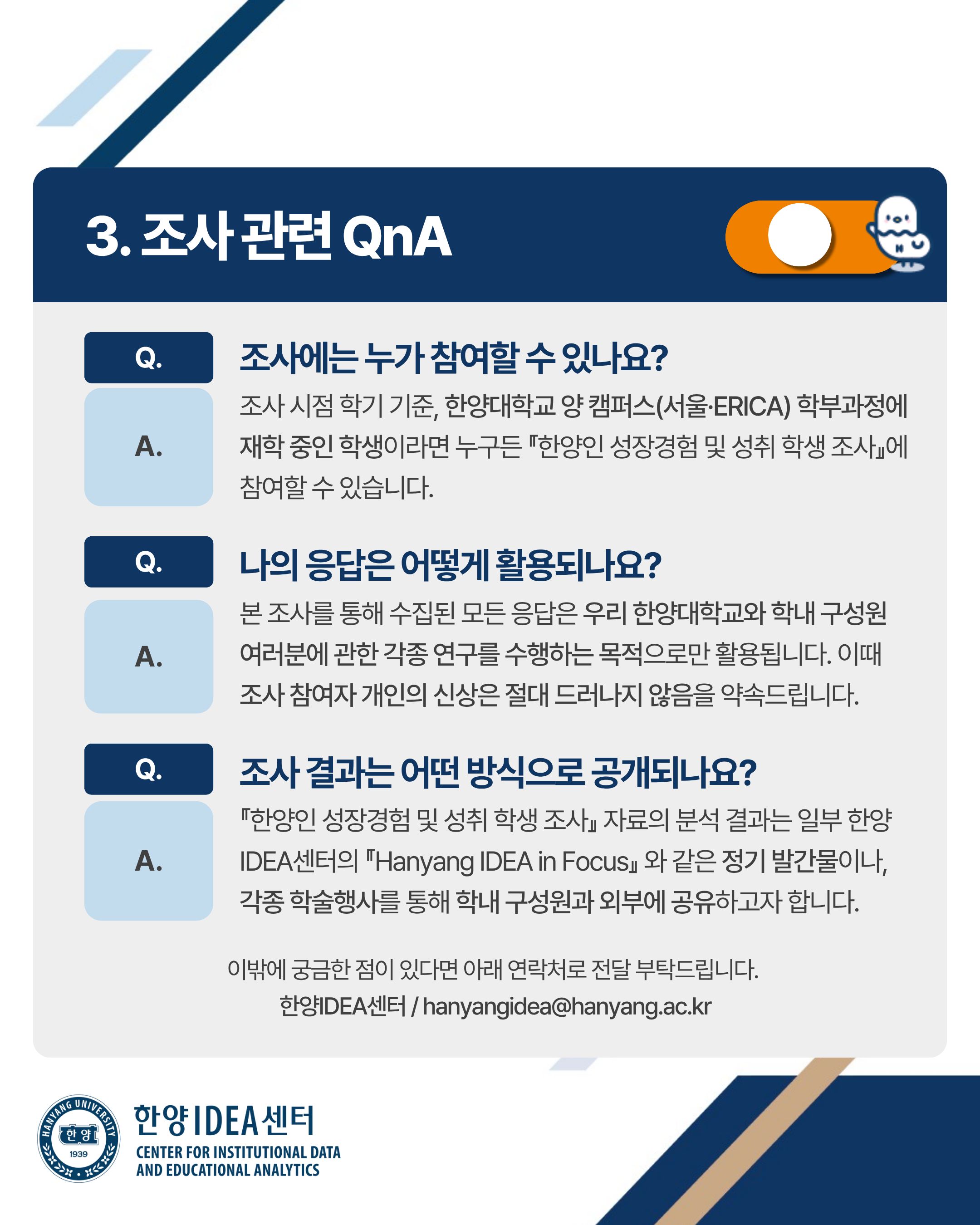 교육혁신처와 기획처 한양IDEA센터에서는 학부 재학생을 대상으로, 대학 생활 전반의 경험을 파악하고, 이에 기반하여 학내 여러 유용한 정책과 프로그램을 개발 및 제공하고자, 기존 '교육수요자만족도조사' 문항을 개편하여 '한양인 성장경험 및 성취 학생 조사'(Hanyang IDEA Student Survey)를 시행하고 있습니다.
