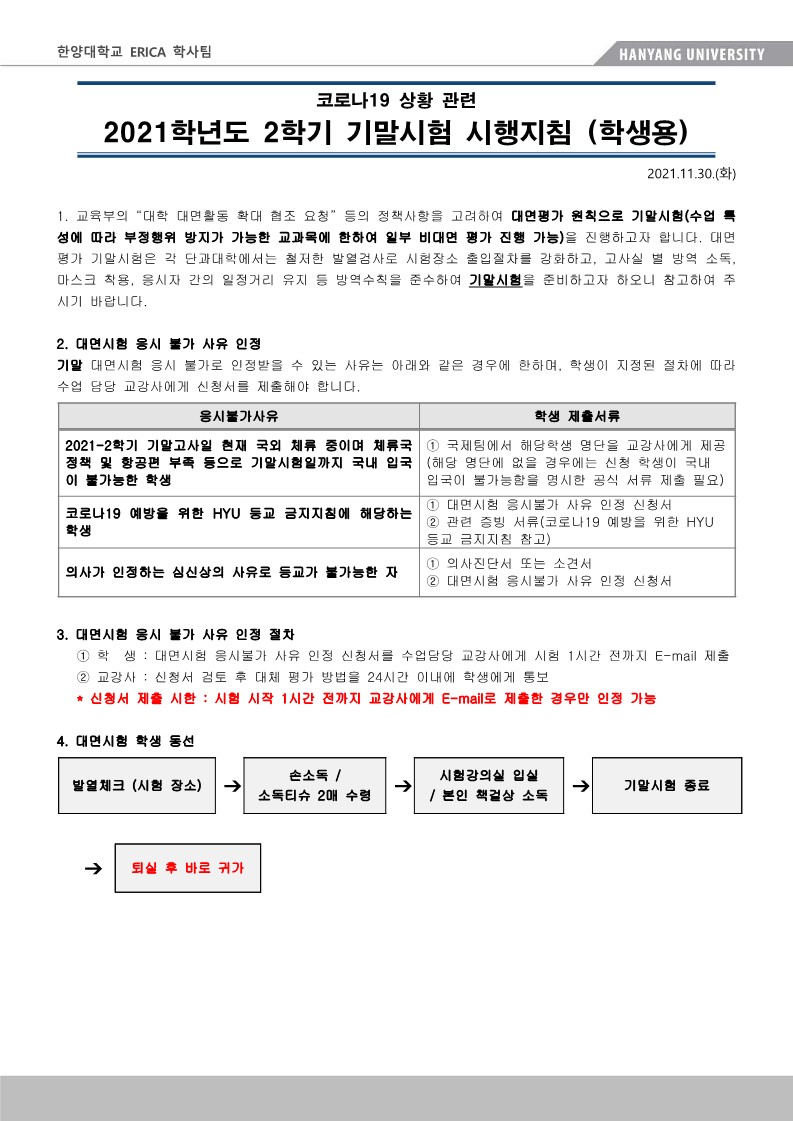2021학년도 2학기 ERICA 기말시험 시행지침 안내
