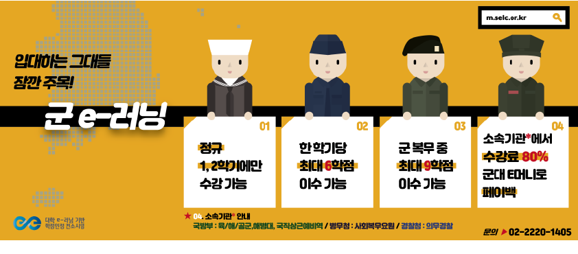 2. 군 e-러닝은 군 복무 중 원격교육을 통해 대학 학점을 취득할 수 있는 제도로 군 복무로 인한 학습단절을 예방하고자 국방부 및 병무청, 경찰청에서 수강료의 80%를 환급해주는 등 국가적으로 지원하는 사업입니다. 복무 중 학점 이수의 기회가 제공되니 적극적인 참여 바랍니다.