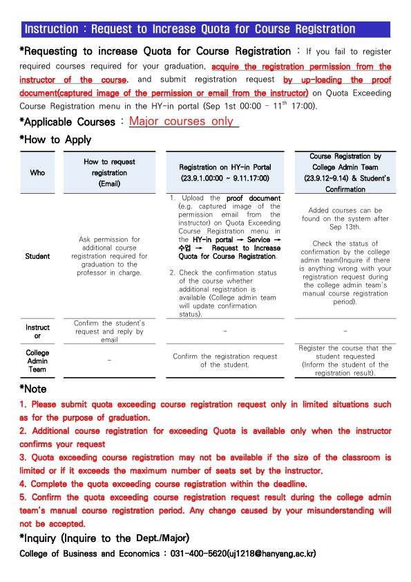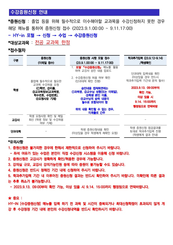 HY-IN [수강증원신청] 메뉴를 입력 하기 전 과목 및 시간이 중복되거나 최대신청학점이 초과되지 않게 9.8(목)까지 본인의 수강신청내역을 반드시 확인하시기 바랍니다. 미확인으로 인한 추가 수강신청 불가는 본인의 책임입니다.