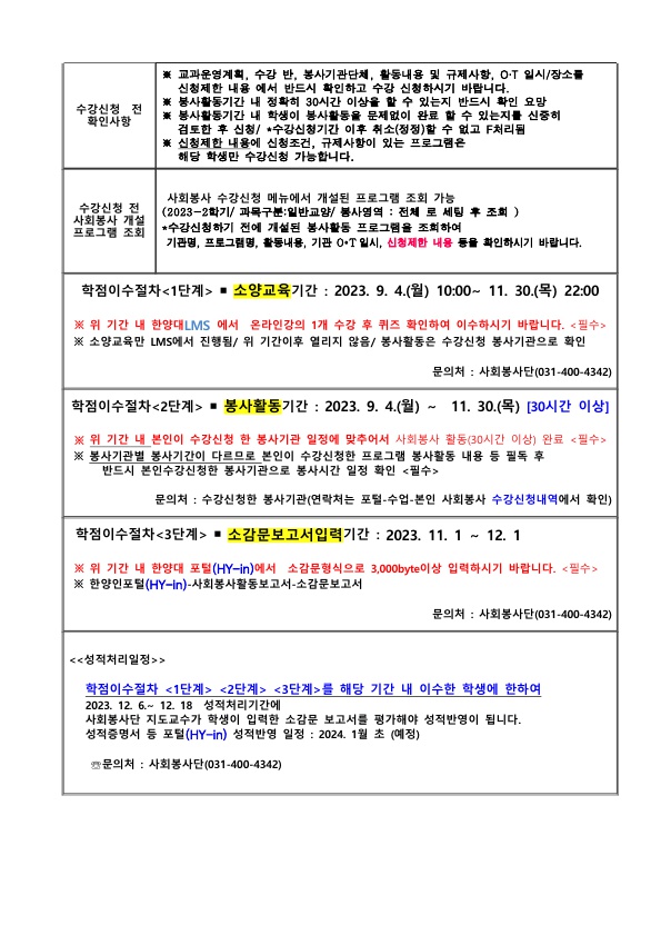 4. 요청사항 : 사회봉사 교과목은 2013학번부터 ERICA캠퍼스 학부생(융합공학과, 스마트융합공학부, 약학대학, 회계세무학과 제외, 약학대학은 2022부터 필수)의 졸업요건이므로 반드시 1학점 이상을 이수해야 졸업이 가능합니다