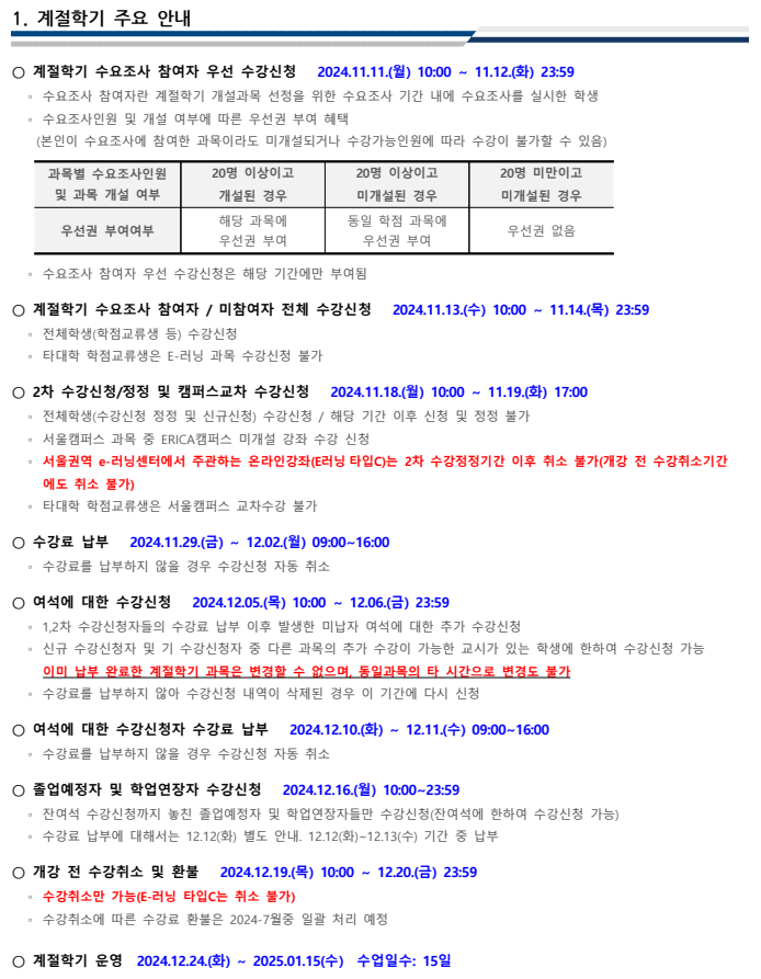 ** 2024 겨울계절학기 수강편람 오픈 : 11. 05(화) 오후부터 오픈