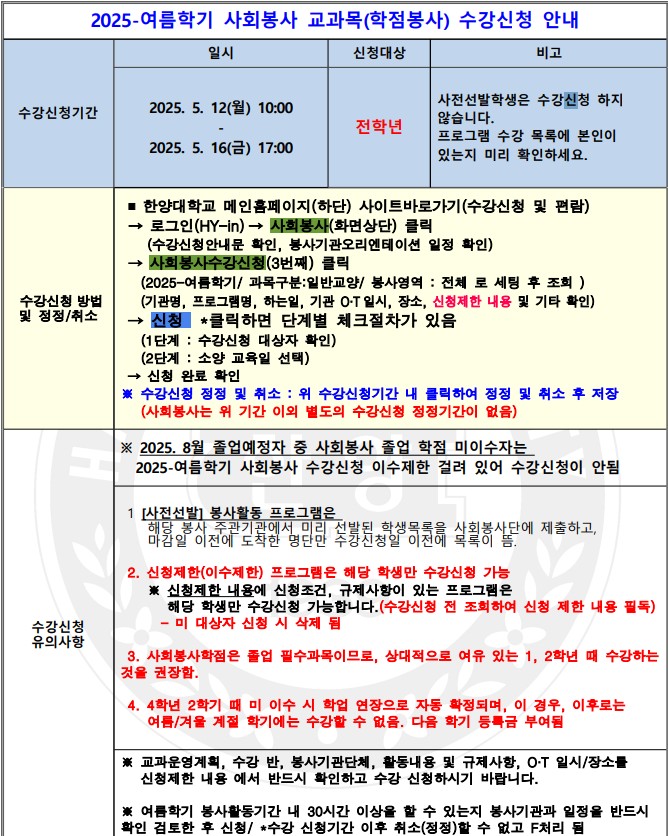 2. 수강신청대상 : ERICA 학부 재학생, 휴학생 (졸업예정자, 학업연장자는 여름학기 사회봉사 수강 불가)