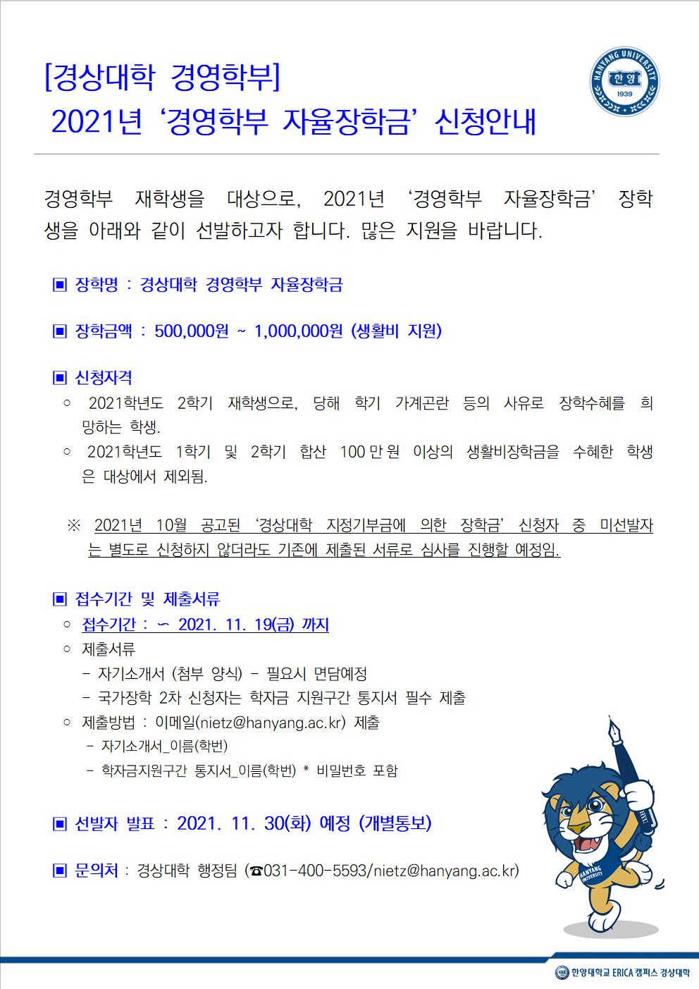 [장학]2021년 '경영학부 자율장학금' 신청안내 (~11/19)