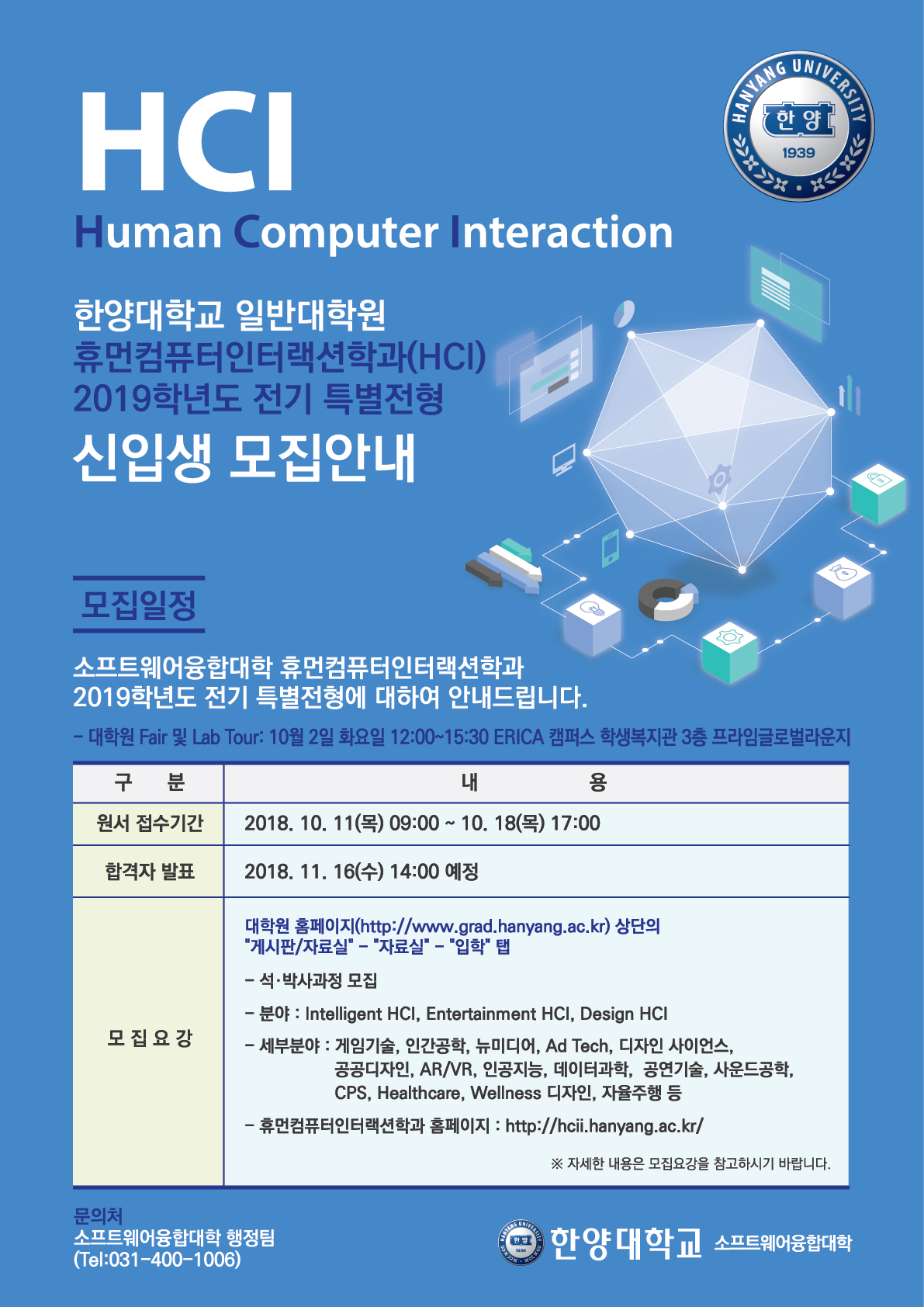 일반대학원 휴먼컴퓨터인터랙션학과(HCI)2019년도 전기 특별전형 신입생 모집안내