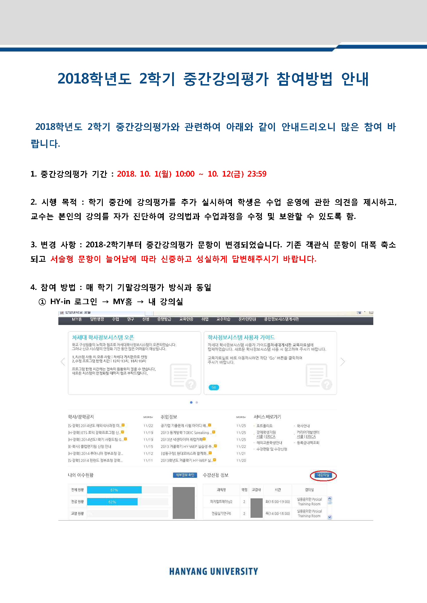 2018학년도 2학기 중간 강의평가 실시 안내