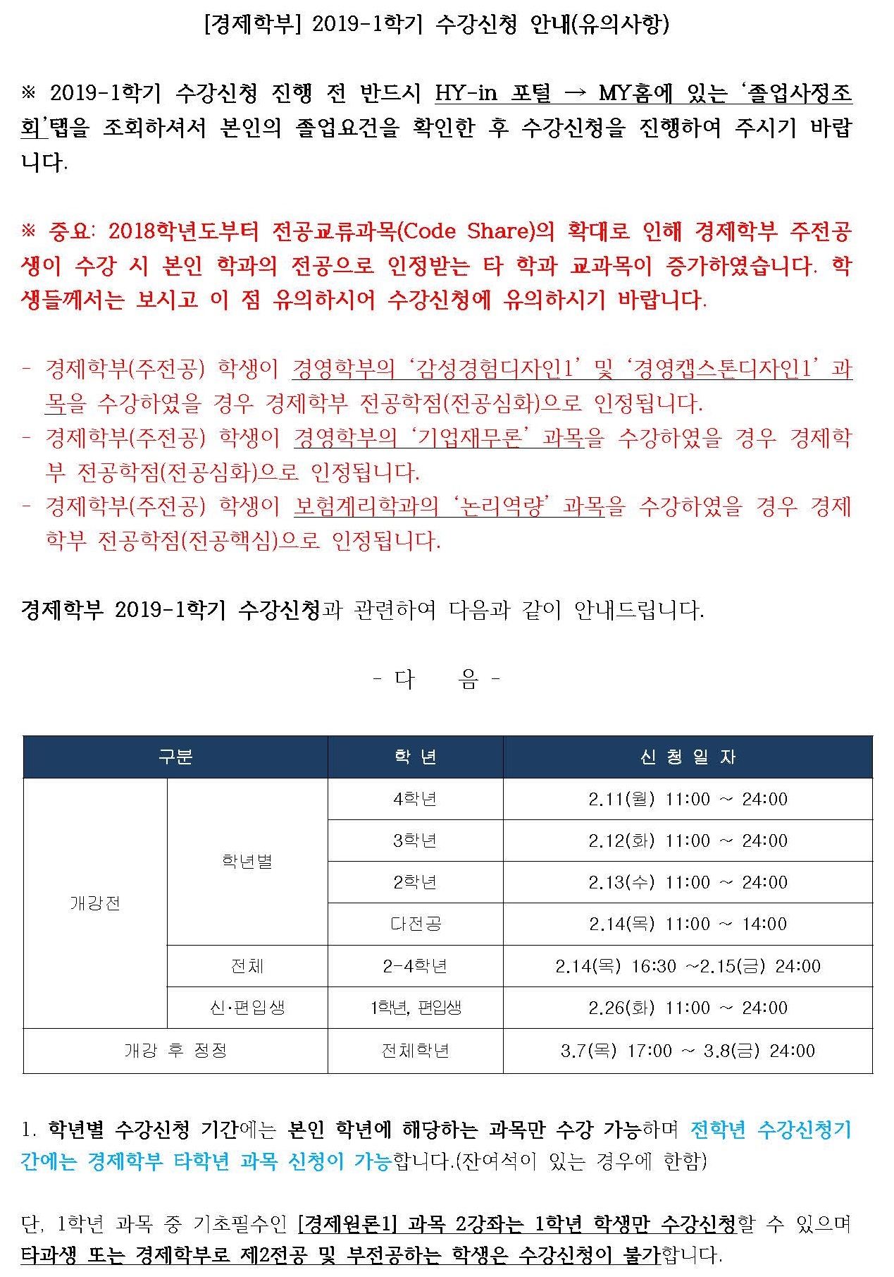 2019-1학기 경제학부 수강신청 안내를 다음과 같이 드리오니