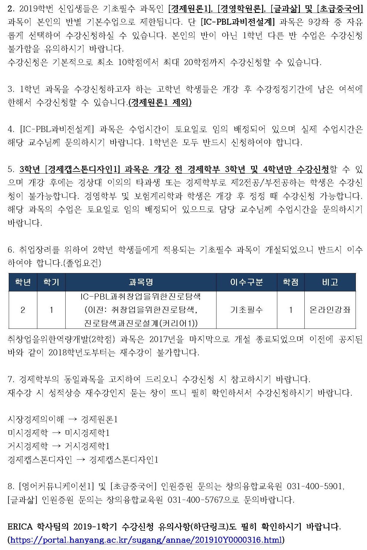 ERICA 학사팀의 2019-1학기 수강신청 유의사항(하단링크)도 필히 확인하시기 바랍니다.