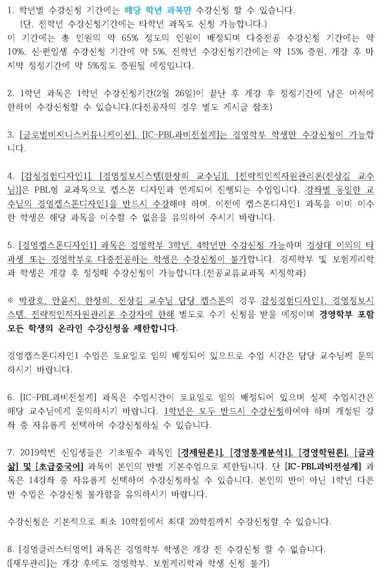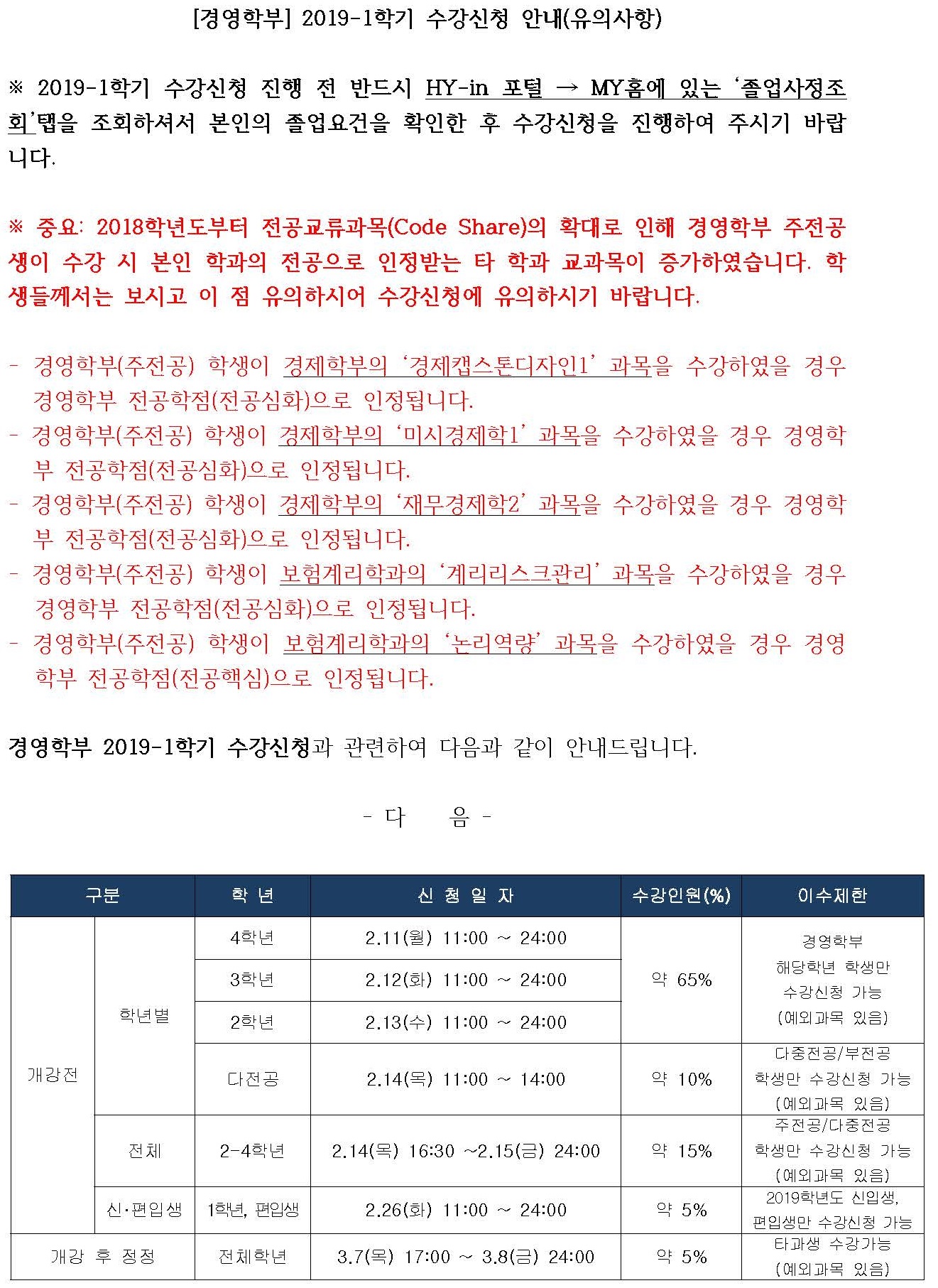 2019-1학기 경영학부 수강신청 안내를 다음과 같이 드리오니