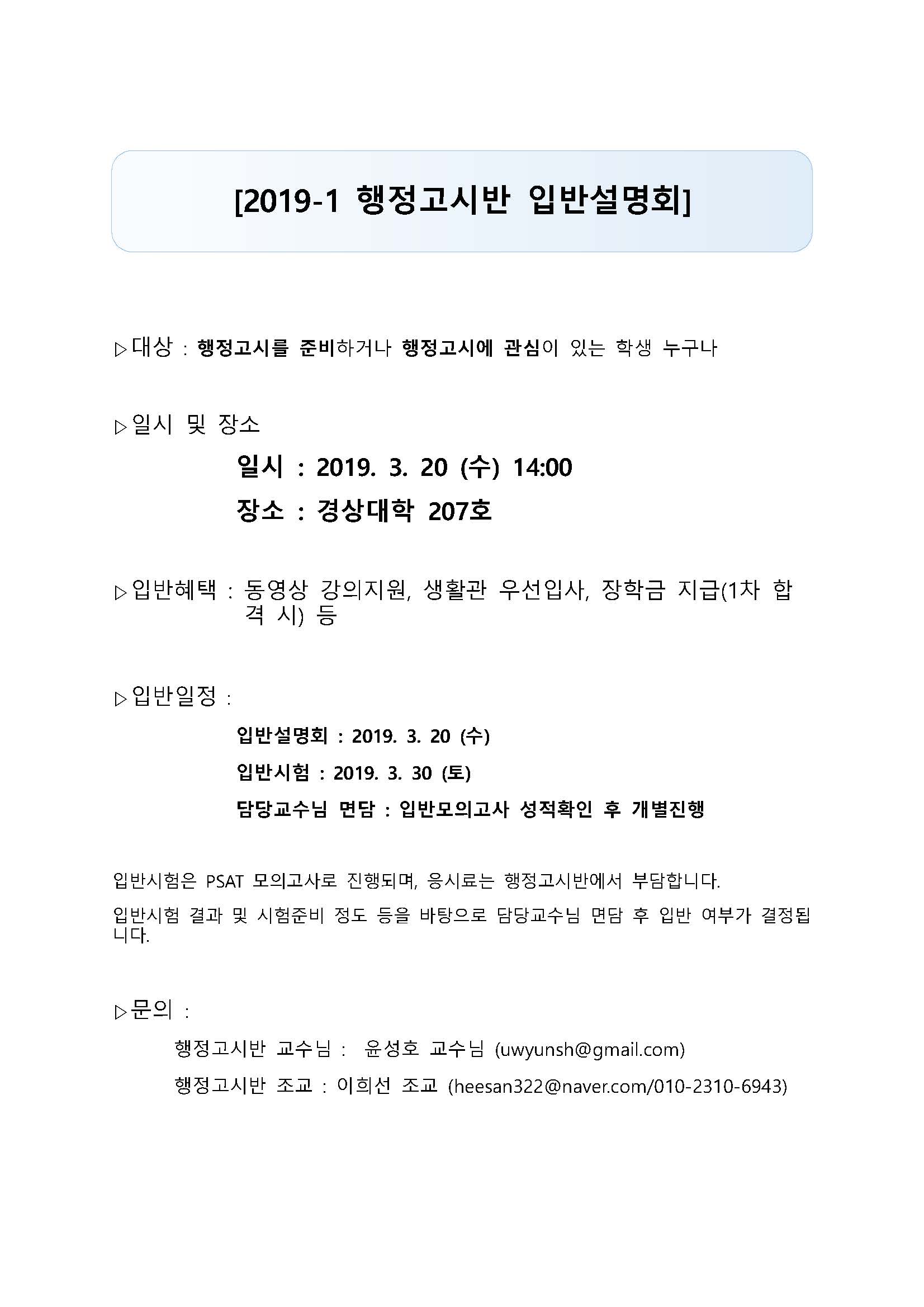 행정고시반 입반 설명회 안내 3/20(수) 13:30 경상관 207호