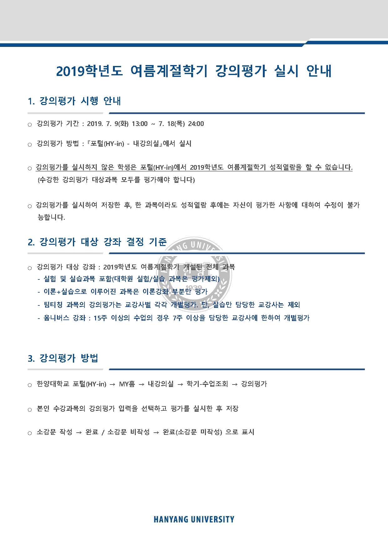 2019-여름 계절학기 강의평가 실시 안내