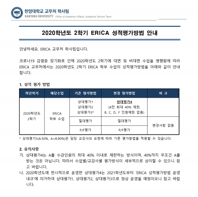 [수업] 2020학년도 ERICA 학부 성적평가방법 안내