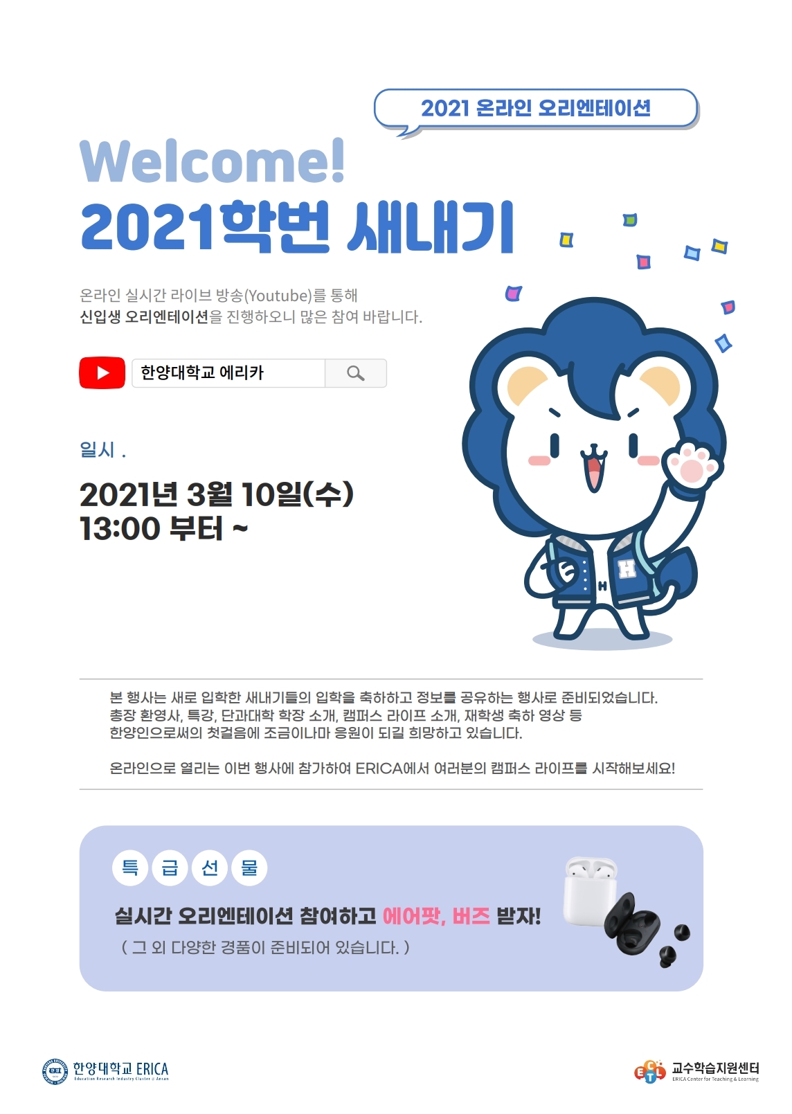 Welcome! 2021학번 새내기 오리엔테이션 행사를 유투브를 통해서 실시할 예정입니다.