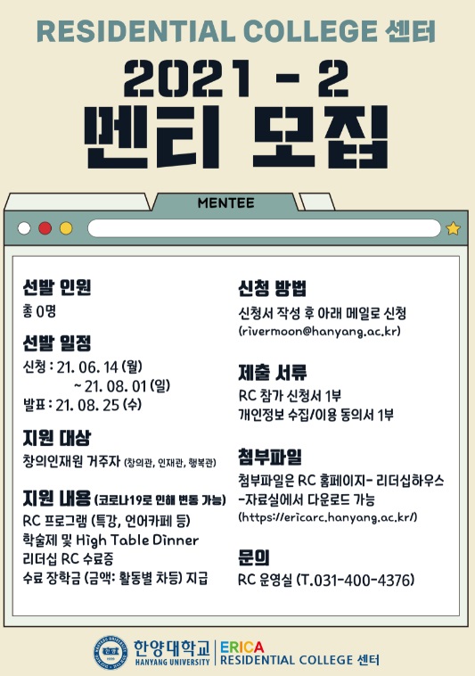 ERICA 한양인재개발원 Residential College센터에서는 2021학년도 2학기에 활동할 신규충원 멘티 모집을 하고있습니다.