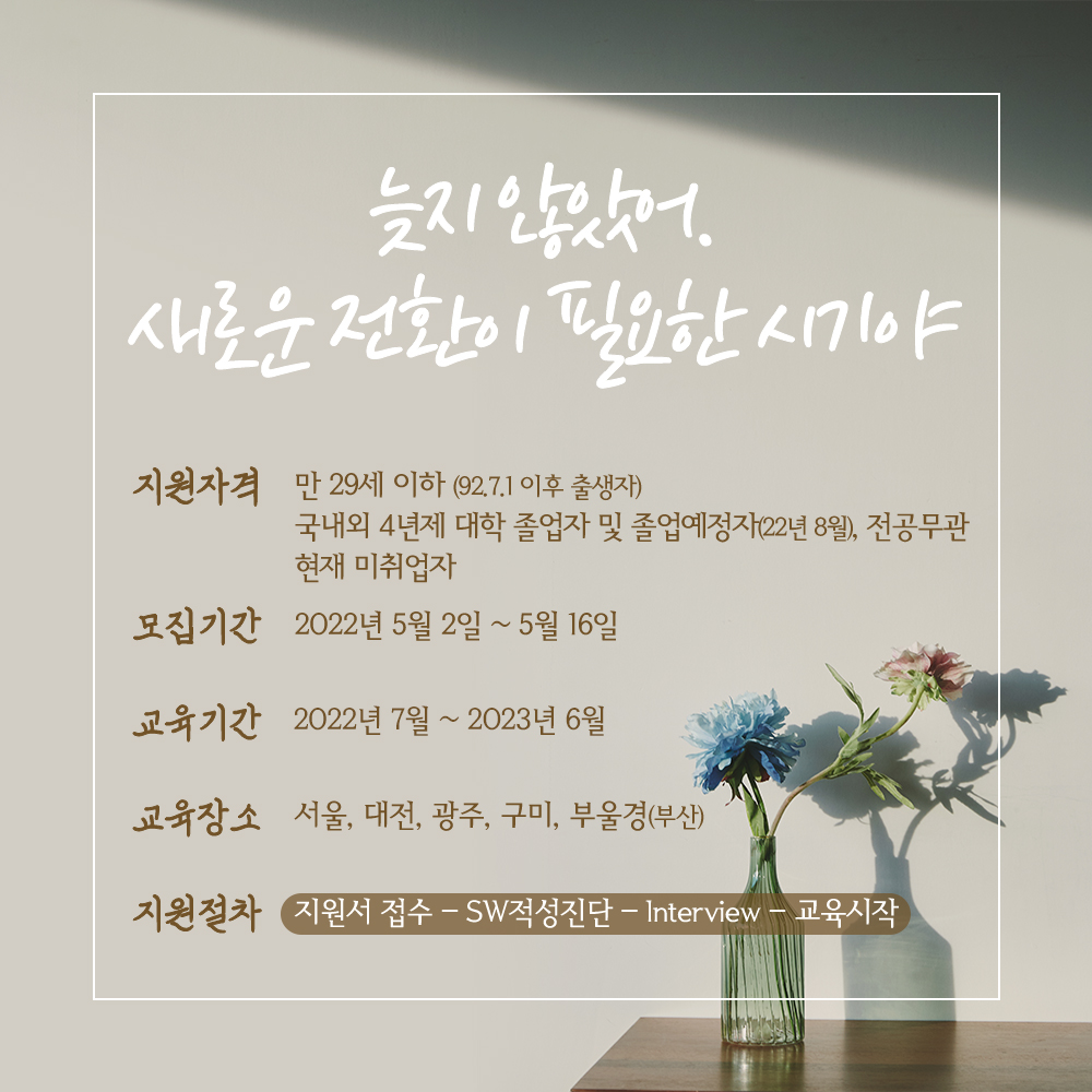 [원서 접수(05.02~05.16) → SW 적성 진단(SW전공/SW비전공) → Interview → 교육 시작(22.07~)]