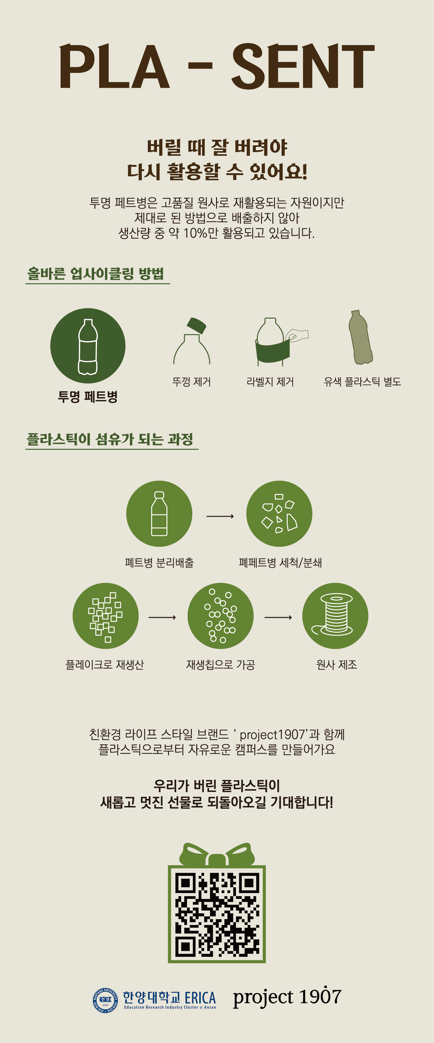 한양대학교ERICA 관재팀에서는 2021학년 2학기 IC-PBL수업 성과물 “한양대 ERICA 환경캠페인 홍보방안”에 동참하여「플라스틱 폐기물 업사이클링(PLA-SENT)」사업을 실시하오니 올바른 플라스틱 사용문화가 정착 될 수 있도록 구성원 여러분들의 많은 관심과 참여를 부탁드립니다.