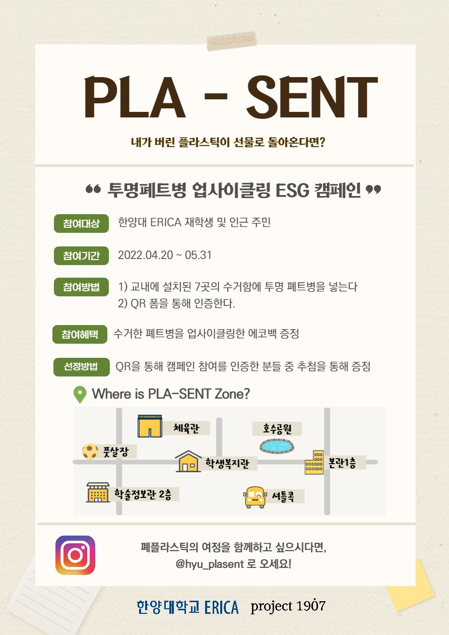 한양대학교ERICA 관재팀에서는 2021학년 2학기 IC-PBL수업 성과물 “한양대 ERICA 환경캠페인 홍보방안”에 동참하여「플라스틱 폐기물 업사이클링(PLA-SENT)」사업을 실시하오니 올바른 플라스틱 사용문화가 정착 될 수 있도록 구성원 여러분들의 많은 관심과 참여를 부탁드립니다.