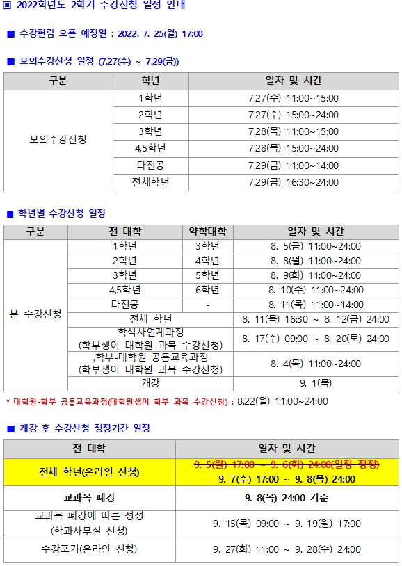 수업 ●[수강신청 일정 변경] 2022학년도 2학기 수강신청 일정 안내● Hit 3272