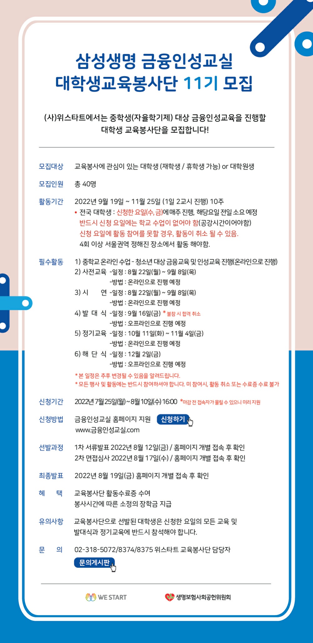 [(사)위스타트] 삼성생명 금융인성교실 대학생교육봉사단 11기 모집(~8/10 16:00)