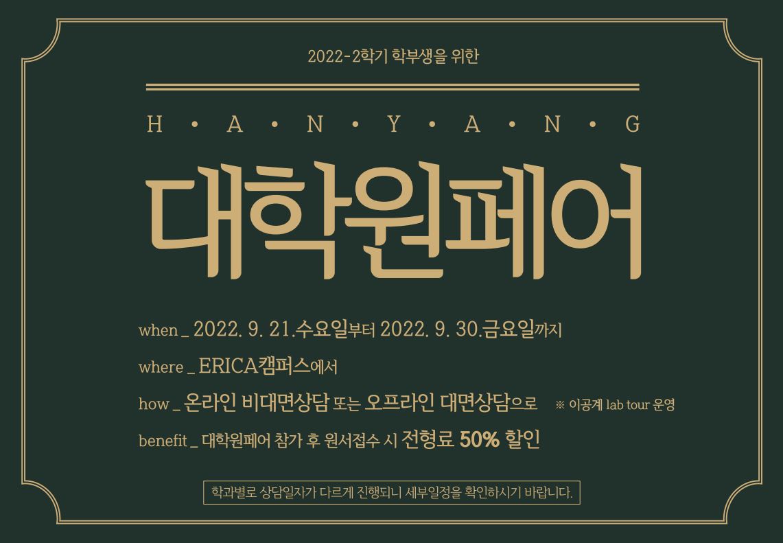 | ERICA | 경상대학 | 금융보험학과 | 9월 23일(금) 09:00-12:00 | 오프라인 대면상담 | 경상관 303호 강의실 |