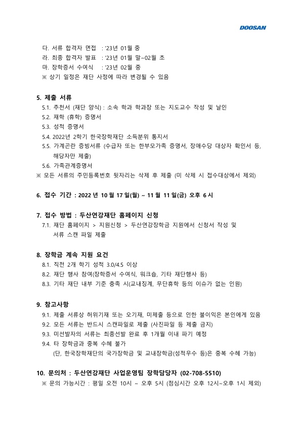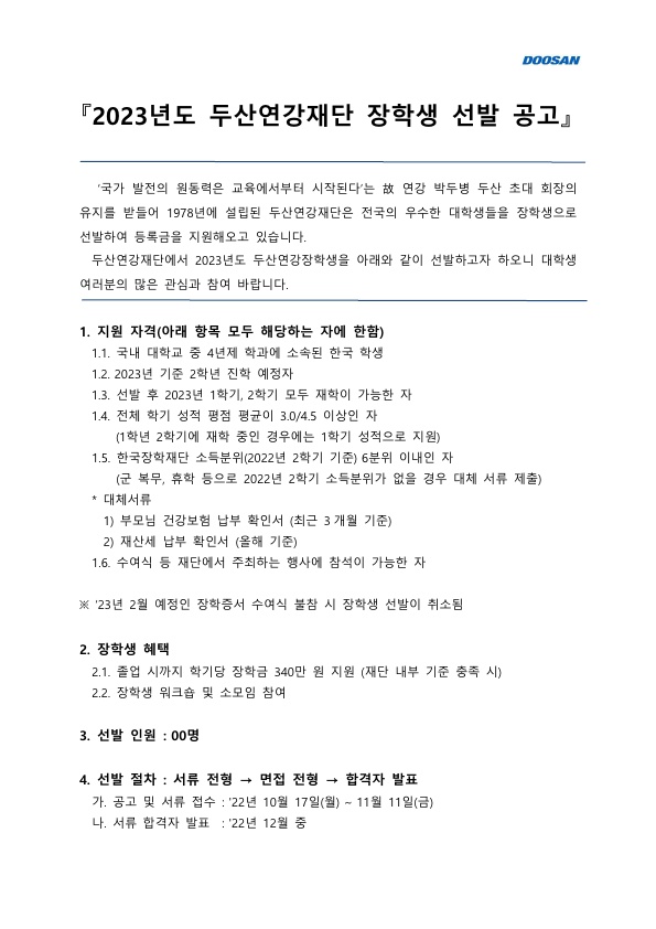 2023년도 두산연강재단 장학생 선발 안내