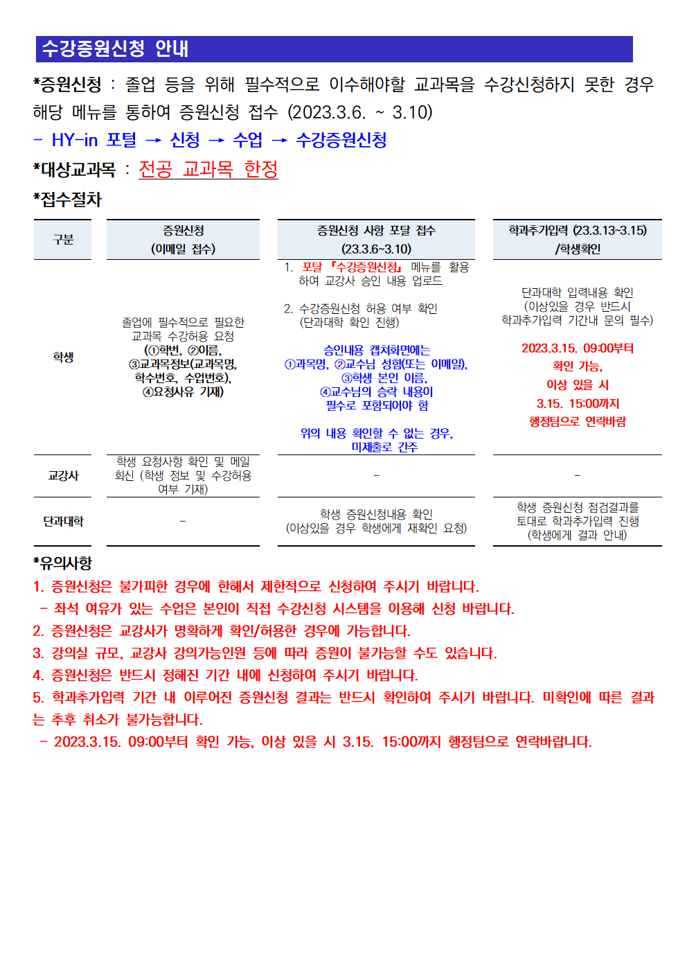 2. 증원신청은 교강사가 명확하게 확인/허용한 경우에 가능합니다.