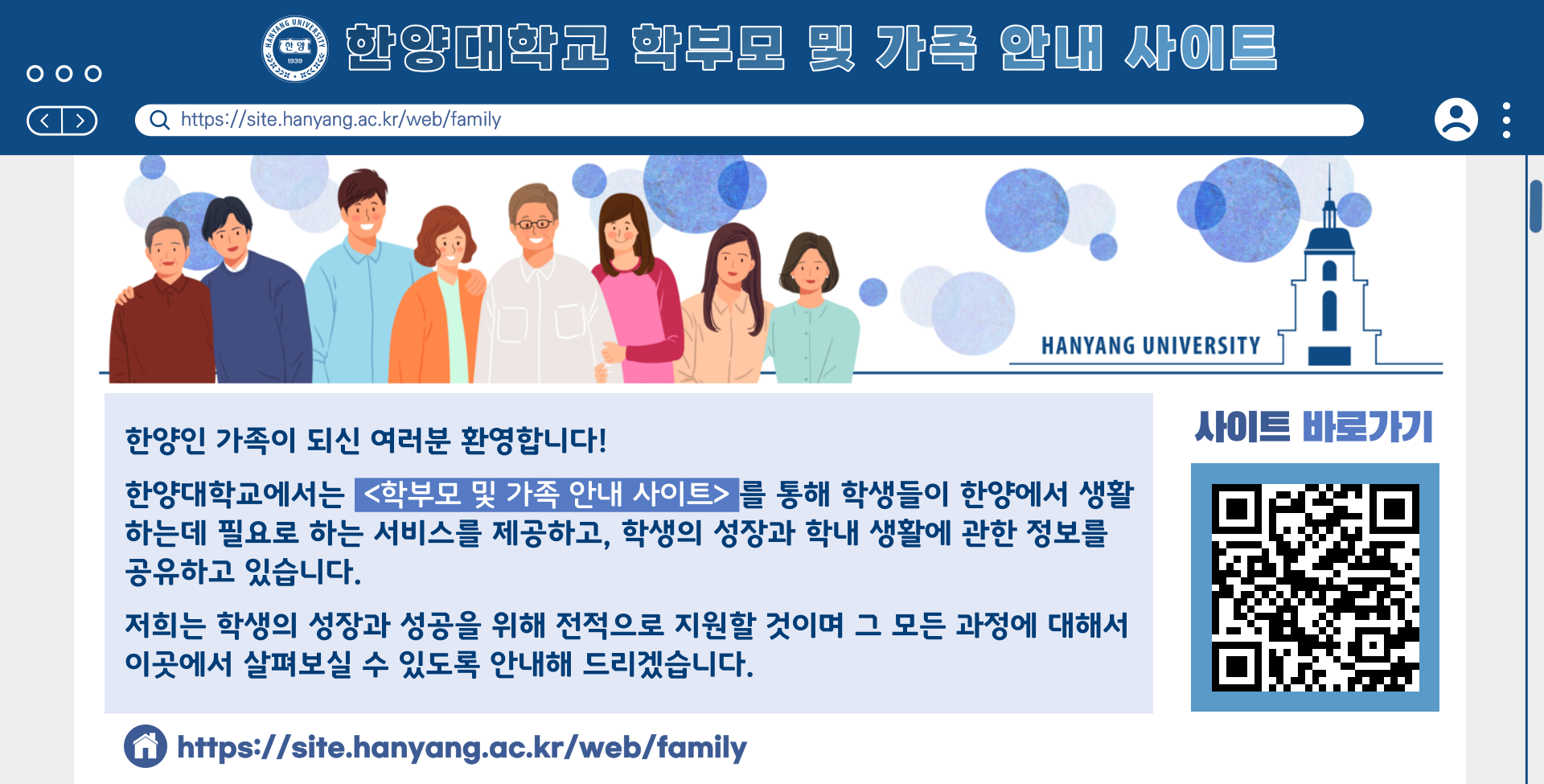 학생의 학교생활 관련 다양한 정보와 제도 등을 학부모 및 가족과 공유하기 위하여 2022년 2학기부터 본교 대표 홈페이지에 "학부모/가족" 페이지를 운영하고 있습니다. 링크 : https://site.hanyang.ac.kr/web/family