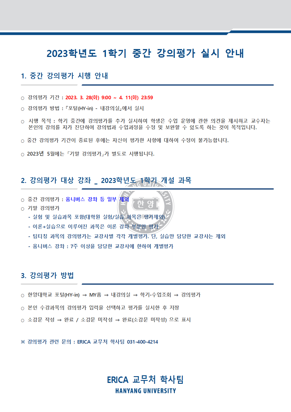 2023학년도 1학기 중간 강의평가 실시 안내