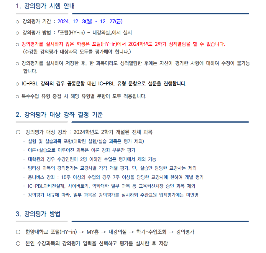 2024학년도 2학기 기말 강의평가 실시 안내 (12.03 ~ 12.27)