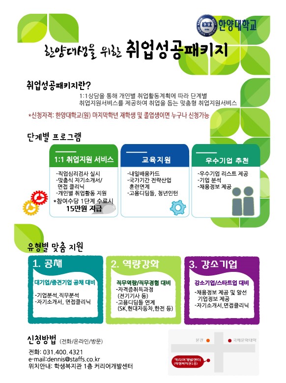가. 온라인 : HY-in 포털 - 취업 - HY-CDP - 취업교육프로그램 - [ERICA]한양대생을 위한 취업성공패키지 신청 (이후 유선으로 방문예약 일정 조정)