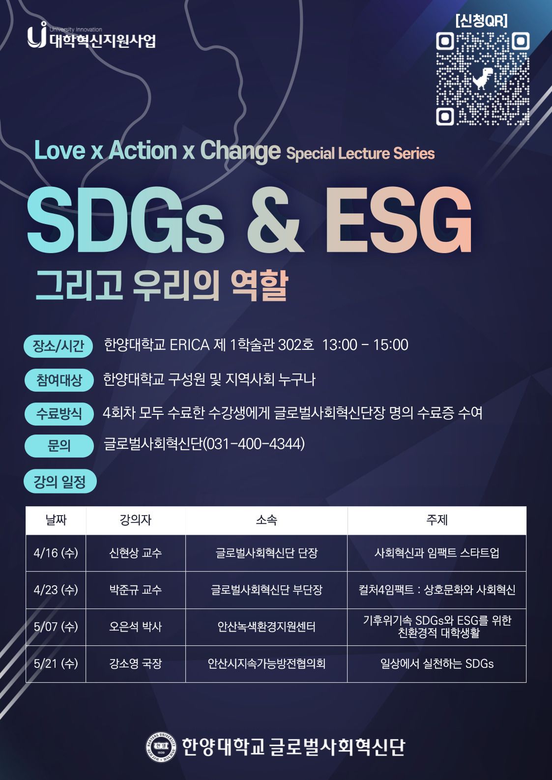 한양대학교 글로벌사회혁신단에서는 SDGs와 ESG 대한 개념을 모두와 함께 알아가고자 현재 이 분야의 중심에 계시는 4인의 전문가와 함께 재미있는 Love X Action X Change Special Lecture Series를 진행 합니다.