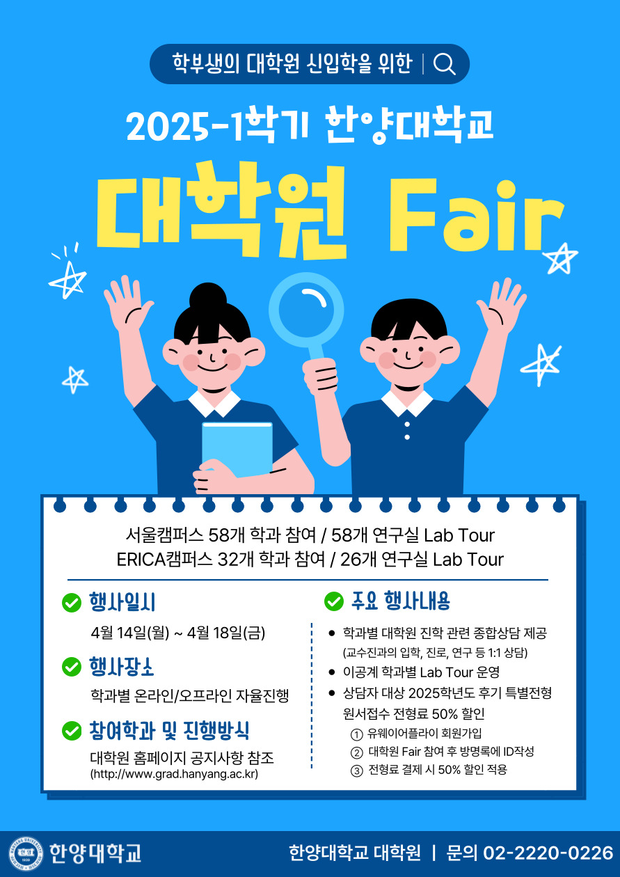 2025-1학기 학부생을 위한 한양대학교 대학원 FAIR를 개최하오니 많은 관심과 참여바랍니다.